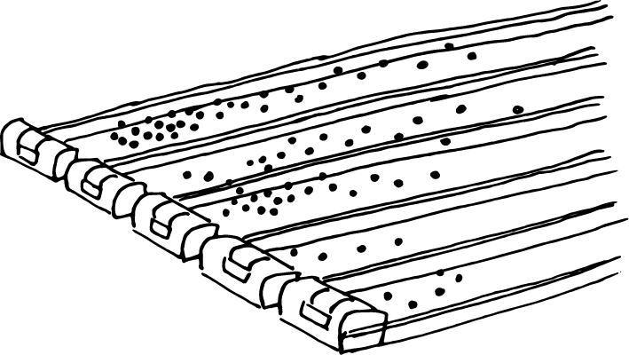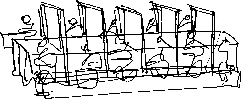 Lullaments: This 40-foot-long work is a kinetic work that, through a to-and-fro motion, a continuous push and pull, develops into a droning rhythmic hum. The repetition alleviates anxiety and also offers a therapeutic sensation of calm and pleasure. The sound can be imagined as both lament and lullaby, carrying a restorative, resounding quality for the contained self.