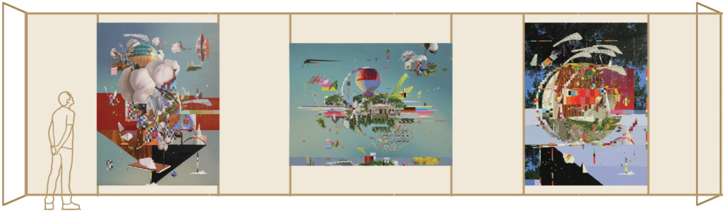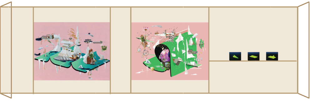 Here, displayed within a temporary structure, the three works converge as a triptych, scenes from a reverie. Resisting the confines of pre-existing categories, they flow into one another, forming a continuum of experience that dissolves boundaries and expands into a shared imaginary.